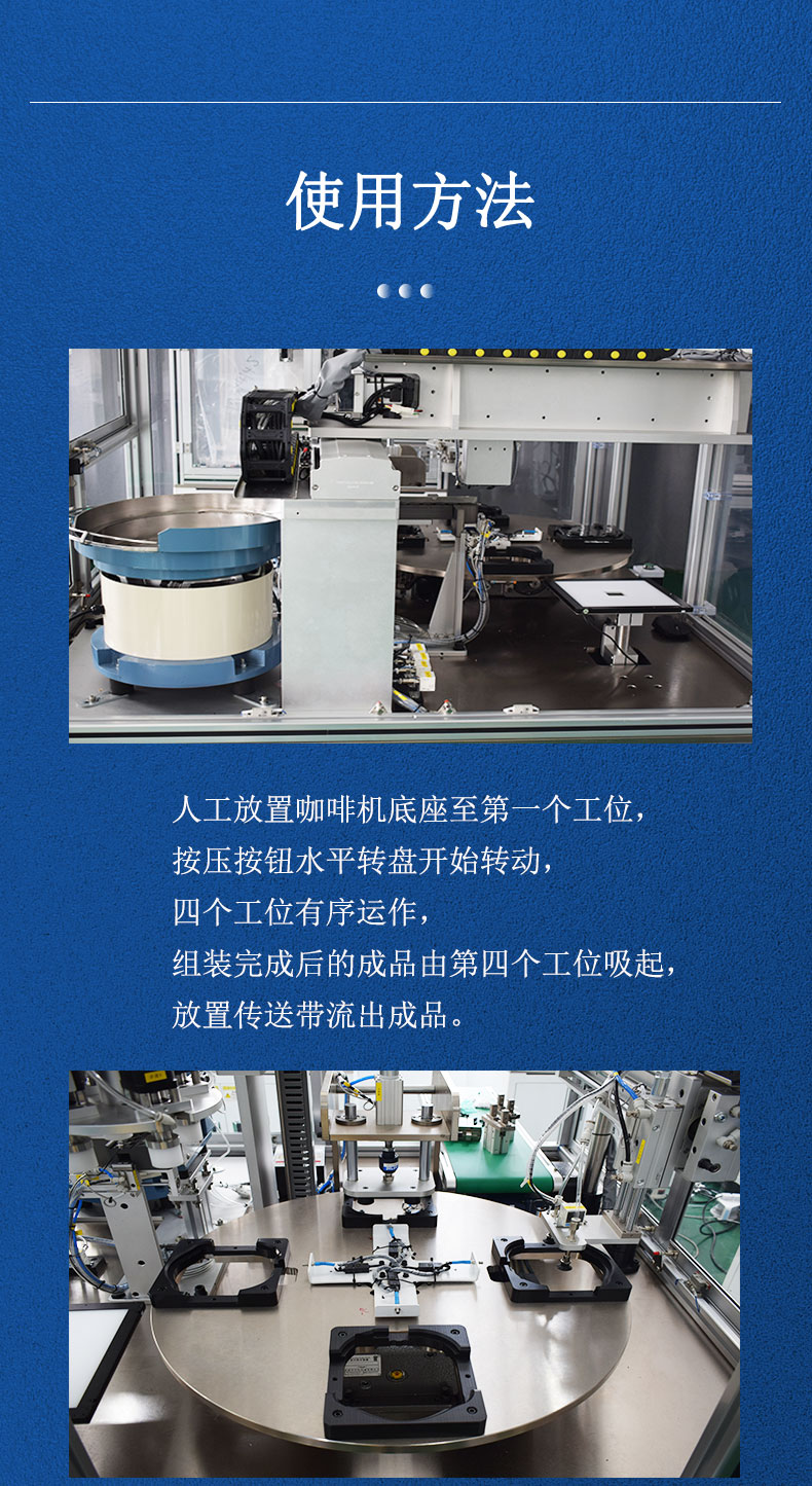 人工放置咖啡機(jī)底座至第一個(gè)工位,按壓按鈕水平轉(zhuǎn)盤(pán)開(kāi)始轉(zhuǎn)動(dòng),四個(gè)工位有序運(yùn)作,組裝完成后的成品由第四個(gè)工位吸起,放置傳送帶流出成品。
