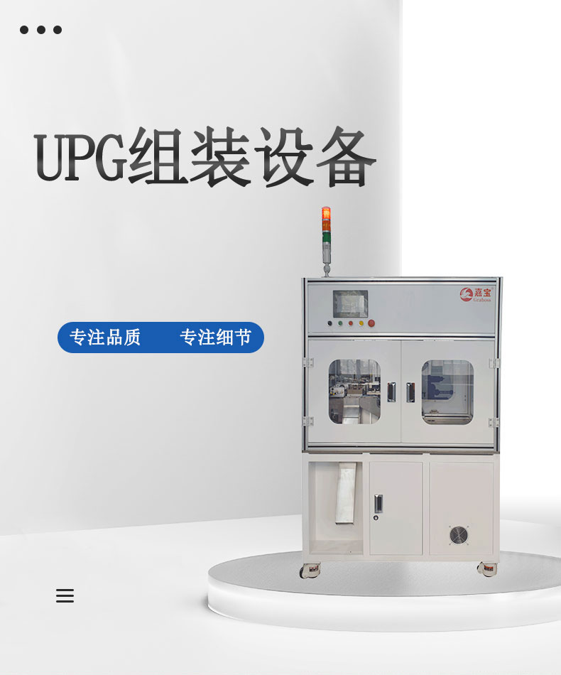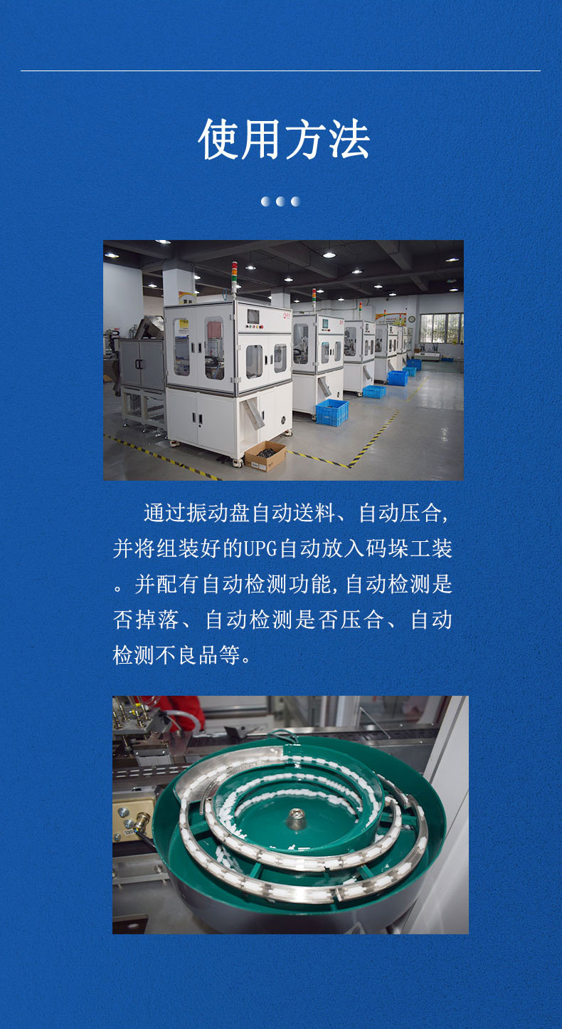 UPG自動組裝。 全程實現全自動化,并配有自動檢測功能,自動檢測是否掉落、自動檢測是否壓合、自動檢測不良品等。