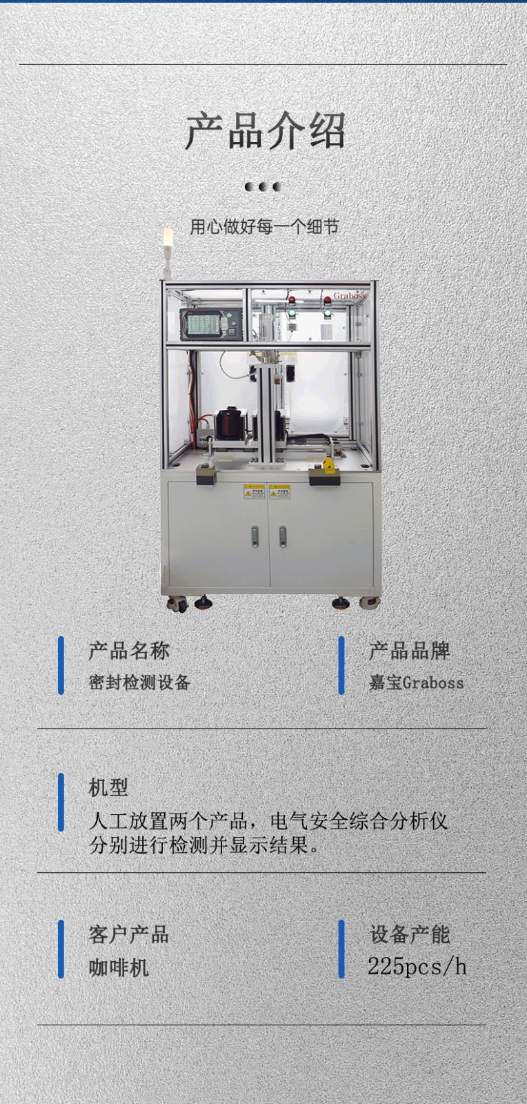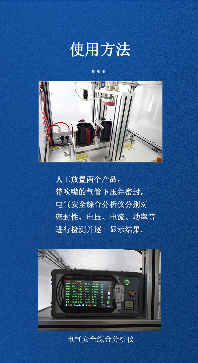 咖啡機密封性檢測、電力電壓電流檢測。人工放置兩個產品,帶吹嘴的氣管下壓并密封,電氣安全綜合分析儀分別對密封性、電壓、電流、功率等進行檢測并逐一顯示結果。